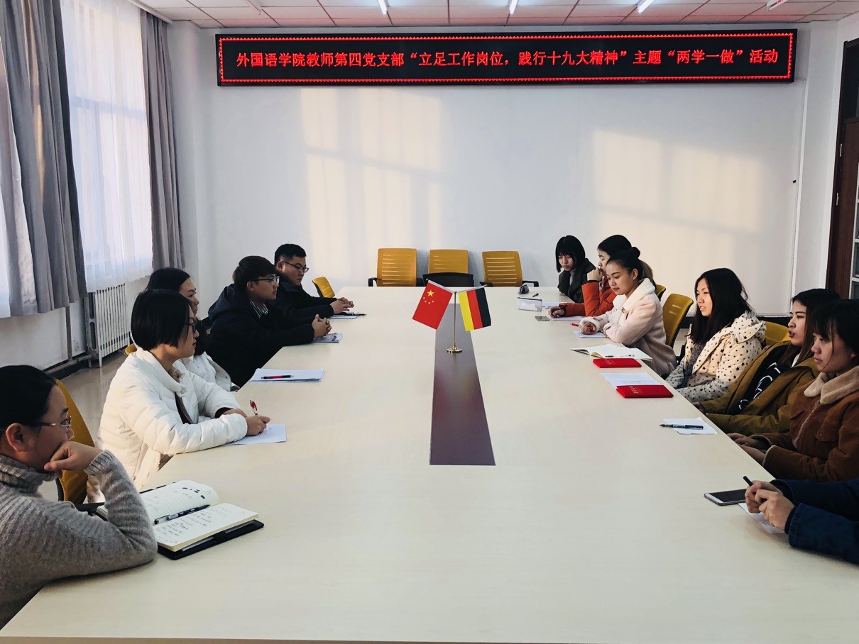 为深入学习十九大精神,结合学科特长,外国语学院教师第四党支部特组织教师及学生党员共同开展了“十九大报告中德双语朗诵会”。活动于12月22日下午3:00在长春校区研发大厦806举行。 习近平总书记在十九大报告中多次...