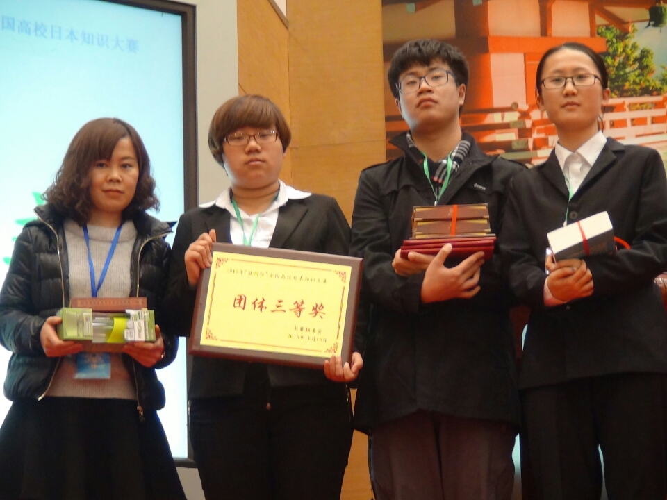 2015年11月14日至15日,由日本科学协会和吉林大学主办的“2015年笹川杯全国高校日本知识大赛”在吉林大学举行,北京大学、南京大学、东北太阳成集团tyc122cc入口、武汉大学等100多所高校参加此次大赛。经过激烈角逐,我院日语专业2013级杨闫晓楠、李林珊和2014级段博文三名同学组成的参赛团队,荣获团体三等奖,指导教师刘丽芳荣获“优秀指导教师奖”。