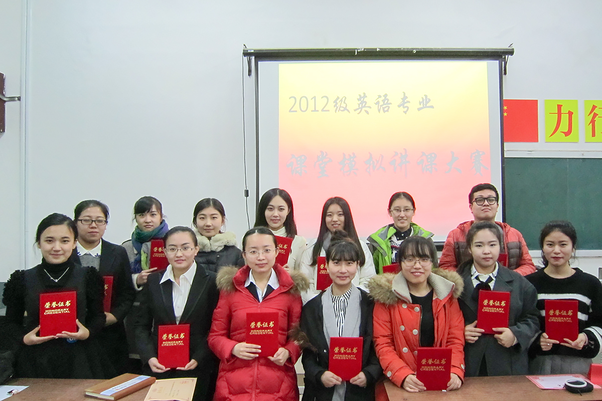 2015年12月16日,我院英语系在2311教室举办了2012级英语专业模拟课堂讲课大赛暨实习生优秀课堂教学展示,英语专业全体大三学生观摩了比赛。大赛评委由英语系杜艳春,侯秀杰,孙桂荣,闫爱静,李艳红等五位老师担任。