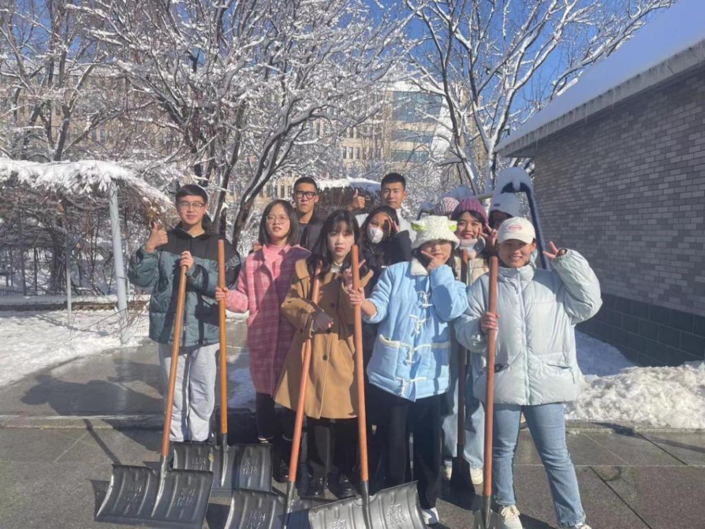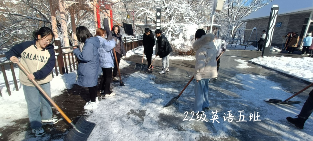 此次破冰除雪行动是一堂真实而生动的劳动教育实践大课。外国语学院充分挖掘可利用资源,秋季清扫落叶、冬季清扫积雪、馆室志愿解说等多渠道拓宽劳动教育途径,让劳动成为外院学子的生活方式,牢固树立‘劳动最光荣’的观念,发挥‘三全育人’成效,共谋共促学生成长成才,逐步形成鲜明时代特点、扎实育人内涵、突出外院特色的劳动教育格局。