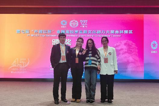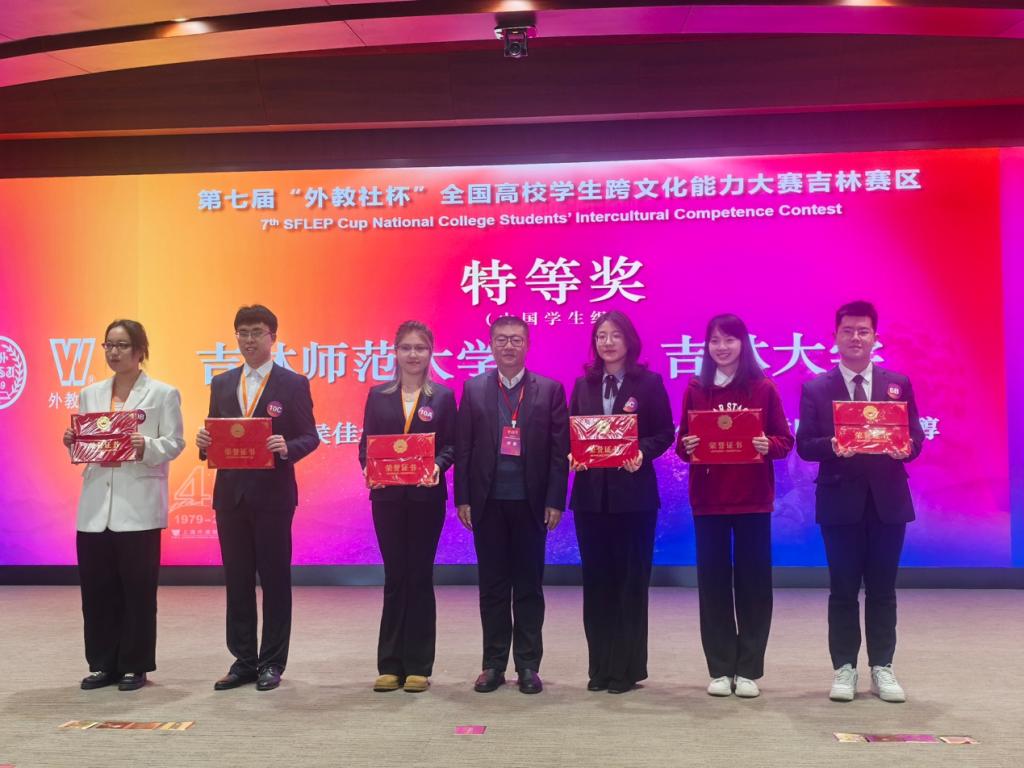 第七届“外教社杯”全国高校学生跨文化能力大赛吉林赛区决赛于11月9日至10日在东北太阳成集团tyc122cc入口成功举办。在全省26支代表队中,我院代表队李宇豪(2023级英语笔译)、侯佳希(2022级物理专业)、高宇婷(2023级化学专业)在刘冬霞、胡晓丽老师的指导下,以总名次第2名的成绩获特等奖,将于12月初在上海与吉林大学一起晋级全国决赛。