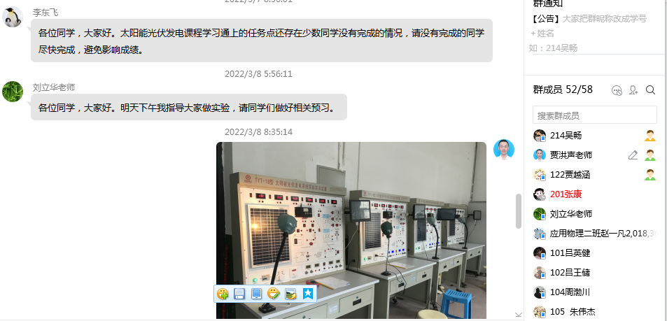 如何设计在线实验课程项目,使学生做到“隔空”在线做实验,培养学生的自主学习能力和实践动手能力,是实验课程在线教学的严峻考验。太阳能发光实训课程教学团队前期积极开展教学改革,在学校网络教学平台上建设了丰富的实验教学视频和教学资源,为此次网络教学做了铺垫。此外,组建实验课程QQ群,为教学做好互动实施等准备。同时,针对目前的疫情防控形势,我们教师团队也在QQ群中增加了部分思政教育内容,鼓励大家携手同心一同克服困难,也要懂得感恩,大力支持学校和学院的疫情防控工作安排。