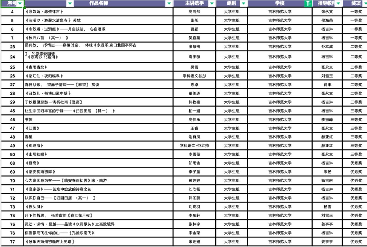 在第六届中华经典诵写讲大赛吉林省赛区“诗教中国”诗词讲解大赛中,我院师生取得了优异的成绩。在全省各高校中,我院师生参赛数量多,获奖人数多,表现突出。据统计,本次大赛吉林省赛区共收到大学教师组和大学生组作品305件,获得优秀奖以上的大学教师组作品18件,我院教师有7件,占比38.9%;获得优秀奖以上的大学生组作品共85件,我院学生有27件,占比31.8%。获得三等奖以上作品推荐参加国赛。其中推送国赛的大学教师组作品共12件,我院教师有5件;推送国赛的大学生组作品共59件,我院学生有17件。本次比赛共有10位教师指导的学生参赛作品获奖。
