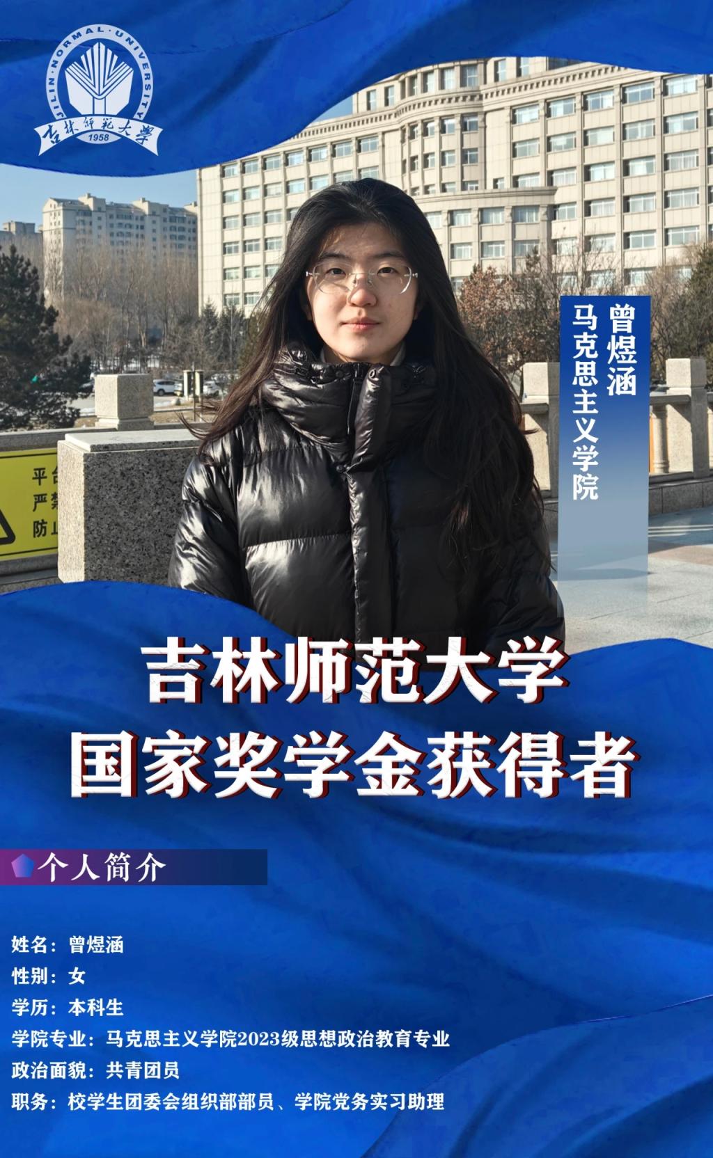 “生逢盛世,应不负盛世;生逢其时,当奋斗其时。”在这个充满活力和希望的时代,曾煜涵始终怀揣梦想,勇敢追求,秉持“好学近知,力行近仁”的吉师校训,以勤奋笃学、不断完善自己为目标,不断超越自我,实现个人的价值,以热爱奉献为航标,望崇山而积跬步,逐光而行 。