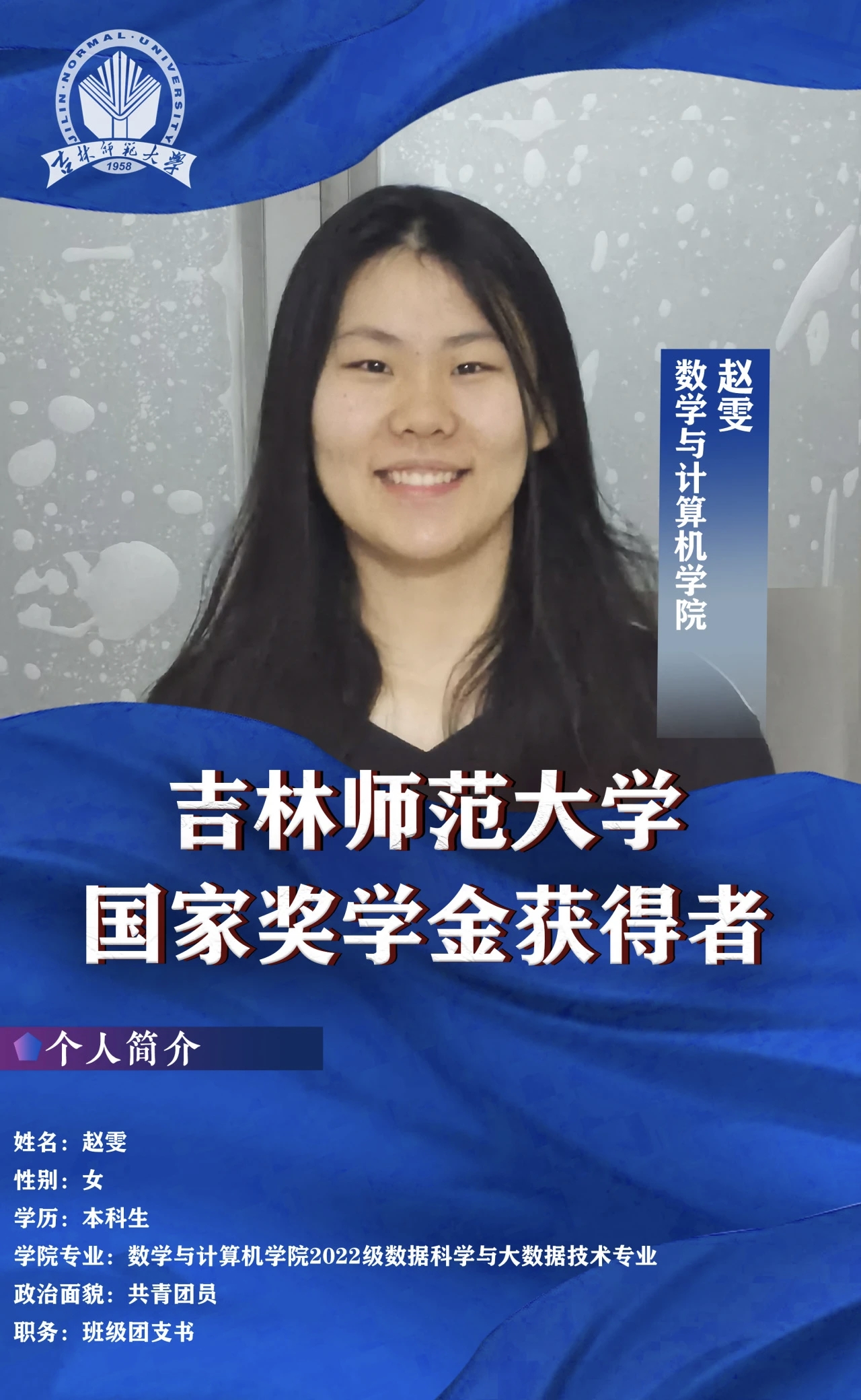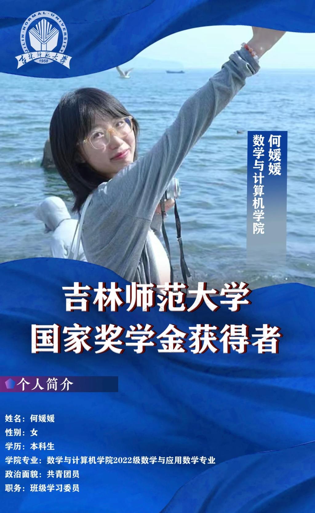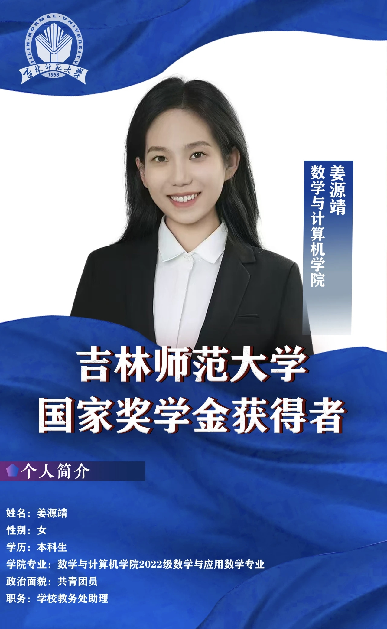 作为一名数计学子,姜源靖深刻领悟“好学近知,力行近仁”的校训内涵,并以此作为自己的人生信条。在大学的三年里她一直勤奋学习,挑战自我,在青春赛道上努力跑出最好成绩,立志成为一位用爱育人、用心教书的好老师。