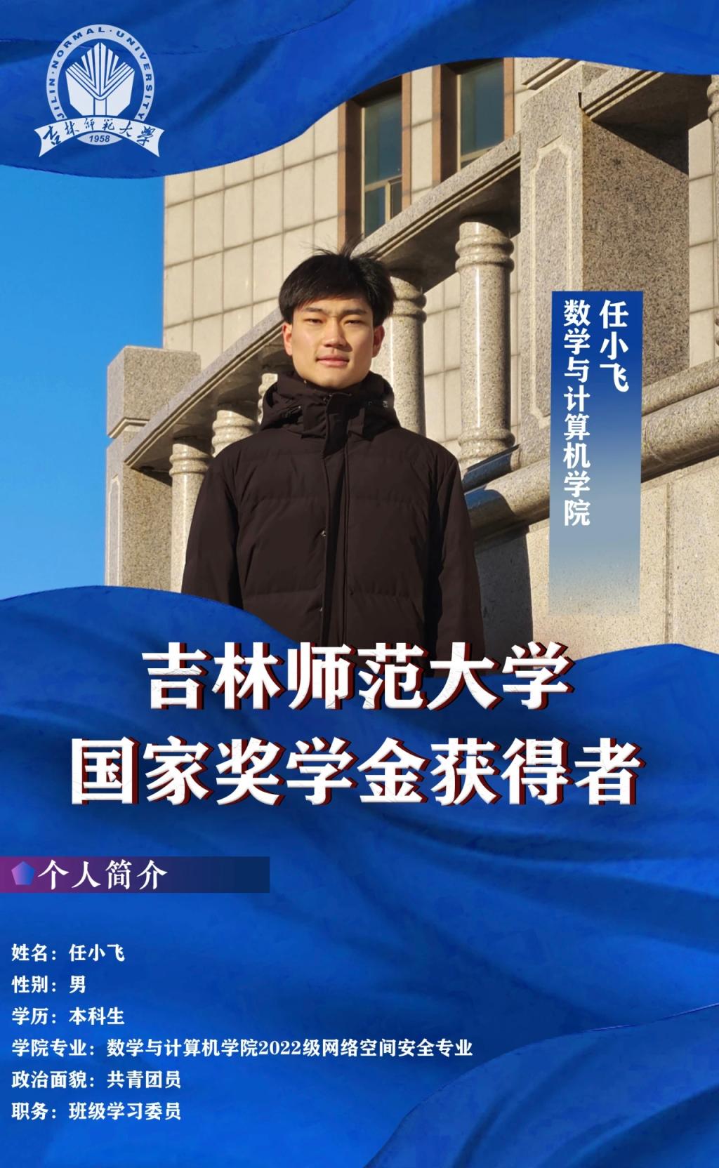在学习的道路上,任小飞同学始终保持积极向上的心态,以勤勉为笔,努力书写属于自己的青春篇章。课堂上,他全神贯注地听老师讲解,认真思考,踊跃参与。在课后,他也总会第一时间整理笔记,系统梳理,定期复盘实现知识内化。他常常会利用课余时间泡在图书馆里,去拓宽知识面,丰富自己的知识储备。学习如逆水行舟,不进则退,他始终保持着高昂的热情去对待这件事。对于课程中遇到的疑难问题,他从不放弃,主动查阅资料,虚心向老师和同学们请教。上一学年他的专业成绩平均绩点为4.075/5.0,综测成绩位列专业第一。入学以来,先后获得了三次一等专业奖学金、国家励志奖学金、“三好学生”称号等荣誉。