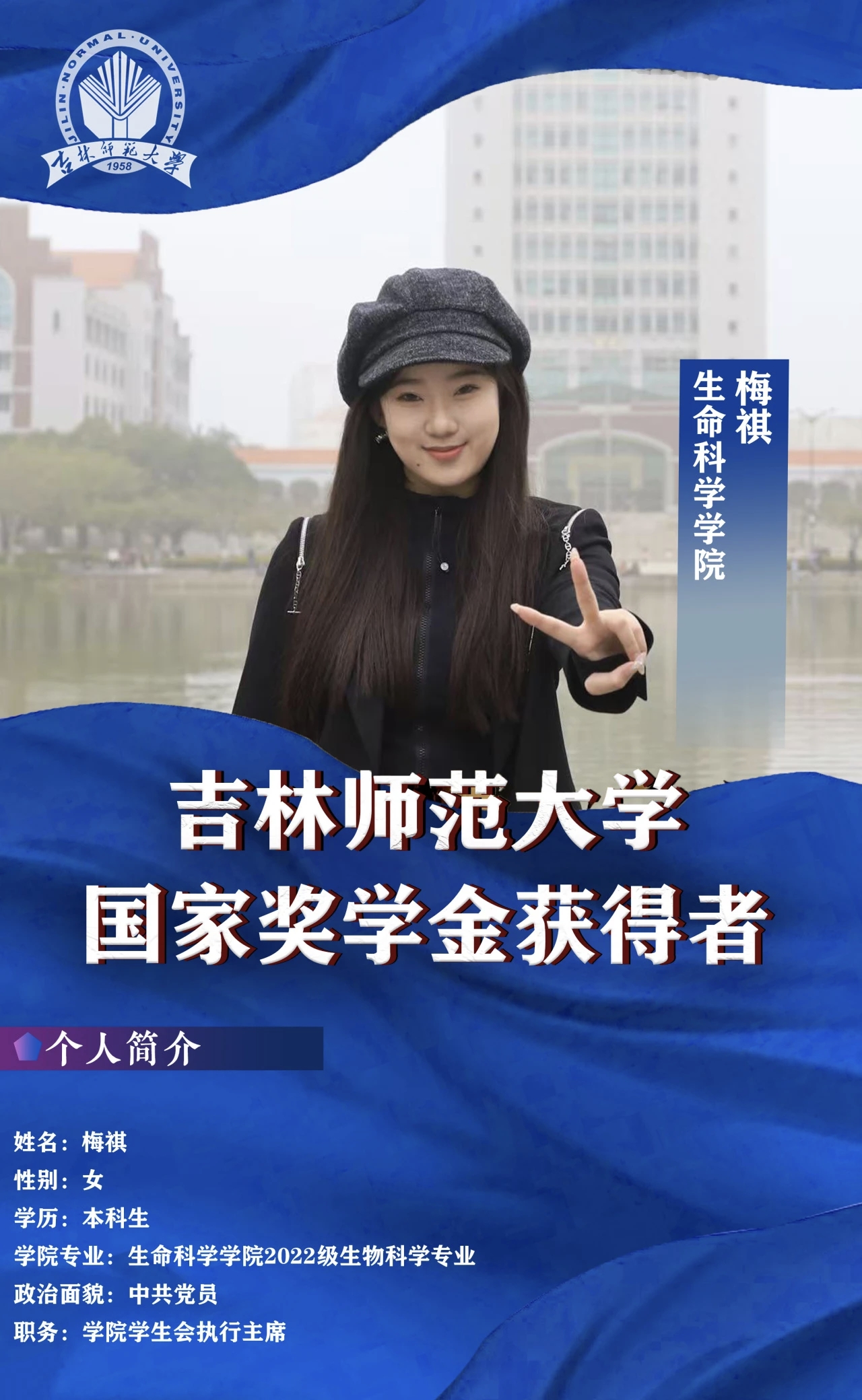 她的优秀不仅仅在于学业和科研方面,还延伸到了校园生活的各个角落。她是积极奉献的志愿者,用行动传递着温暖与爱心;她是第九届金话筒主持人大赛二等奖的获得者,舞台上的她自信大方,用声音传递着情感与力量;她多次获得一等专业奖学金,被评为“三好学生”“优秀干部”等荣誉称号,这些荣誉背后是她在学习、品德、社会实践等多方面的发展。“每一次的实践活动都是一次成长的机会,让我能够从不同的角度去认识世界,也让我更加明白自己的责任与担当。”梅祺在丰富多彩的校园实践中不断磨砺自己,成为一个综合素质过硬的新时代女性。