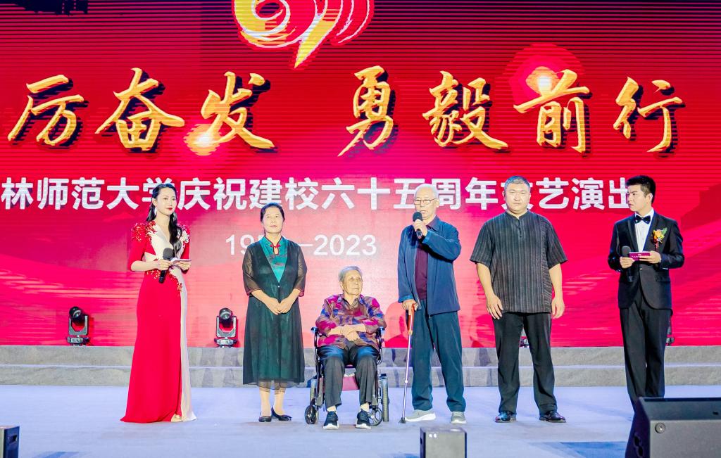 演出以歌舞、合唱、乐器演奏、创意舞蹈展示等多种形式全方位展示了全校师生拼搏进取、善于创新、自强不息的精神风貌。气势恢宏的学校65周年宣传片,立体呈现了吉师65年的光辉历程,彰显了吉师人为党育人、为国育才的不懈追求和深厚情怀;小合唱《我和我的祖国》,由退休教师、青年学生和少先队员三代人联袂演唱,深情表达了吉师人浓浓的爱国情和拳拳的报国心;校旗传递《弦歌永续》创意新颖,不同时期的校旗、17个学院的院旗在璀璨的聚光灯的映衬下熠熠生辉,生动表现了吉师人与学校荣辱与共,休戚相关的血肉深情。演出现场,荣获吉林省首届教育世家称号的陈铁楠老师一家人的感人采访,获得师生的阵阵掌声,新一代吉师人也将传承好、发扬好吉师师者的光荣传统,坚决扛起时代使命,展现青春担当,续写育人华章。歌伴舞《相亲相爱》,昭示着新时代的吉师人将继续勠力同心,苦干实干,朝着特色鲜明、多学科协调发展的高水平太阳成集团tyc122cc入口目标阔步前进。