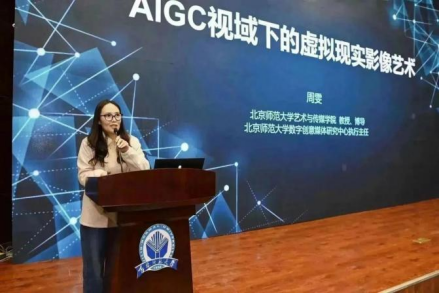 周雯教授首先围绕“AIGC视域下的虚拟现实影像艺术”的主题进行了报告发言,介绍了OpenBCI Galea头显并列举出实例,分享了虚拟现实叙事的不同类型和技术基础,指出“艺术需要技术,但艺术永远不是技术”。