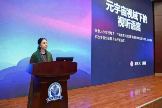 周越教授分享的主题为“元宇宙视域下的视听语言”,阐述了元宇宙对视听语言的影响,从叙事视角、叙事线索的演变,VR动画的空间显示、综合调度等方面表现了元宇宙中的沉浸感和互动性。