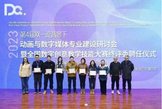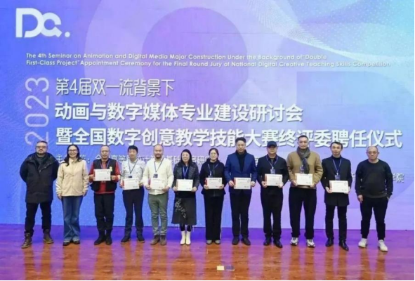 会议最后,谢清风秘书长为受聘全国数字创意教学技能大赛终评委专家颁发聘任证书,并合影留念。我院院长夏维波教授、动画系主任王军华副教授、数字媒体艺术系姜旬恂副教授受聘为大赛终评委。