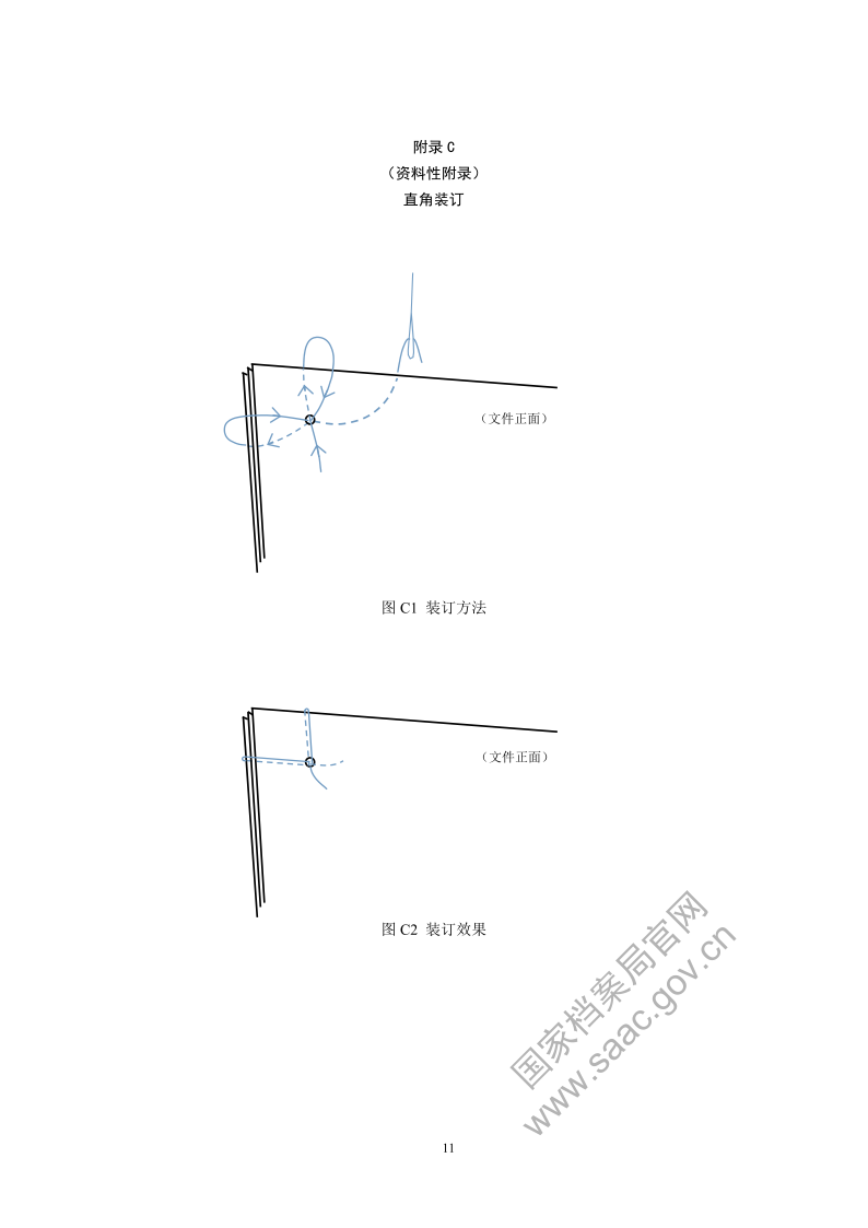 6.2.4 永久保管的归档文件,宜采取线装法装订。页数较少的,使用直角装订(见附录 C 图 C1、图 C2)或缝纫机轧边装订,文件较厚的,使用“三孔一线”装订。永久保管的归档文件,使用不锈钢订书钉或浆糊装订的,装订材料应满足归档文件长期保存的需要。