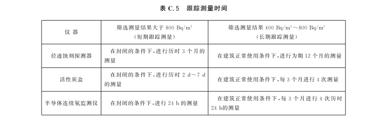 跟踪测量应优先选用累积式测氡仪,例如,径迹蚀刻探测器和活性炭盒,以便于估计房间的年平均氡浓度。如果筛选测量结果在400Bq/m3 ~800Bq/m3之间,那么跟踪测量可以选择短期测量(1d~90d)或者长期测量(90d以上),这依据测量方法(仪器)而定。如果筛选测量结果大于800Bq/m3 或者要求快速知道结果,则建议进行短期跟踪测量,这有助于档案部门快速决定是否需要进行治理,并且避免由于长期测量的附加照射引起的健康危险的增加。跟踪测量周期见表C.5。
