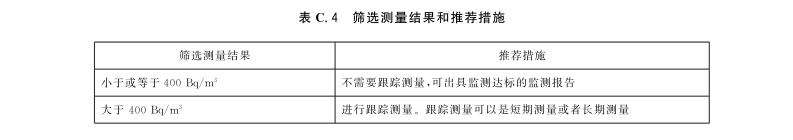 如果筛选测量结果在400Bq/m3以上,则应进行跟踪测量。按照筛选测量结果选择相应措施,见表C.4。