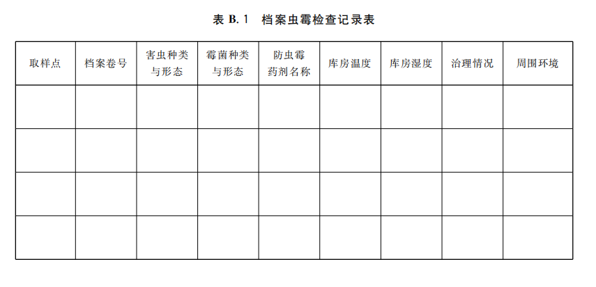 检查时,应详细记录当日库房温湿度、标本数量、采集地点与环境、受害档案的形成年代与材质、档案受害部位、虫霉种类与形态、用过何种防霉驱虫药剂、曾用何种技术治理等,具体参见附录B。