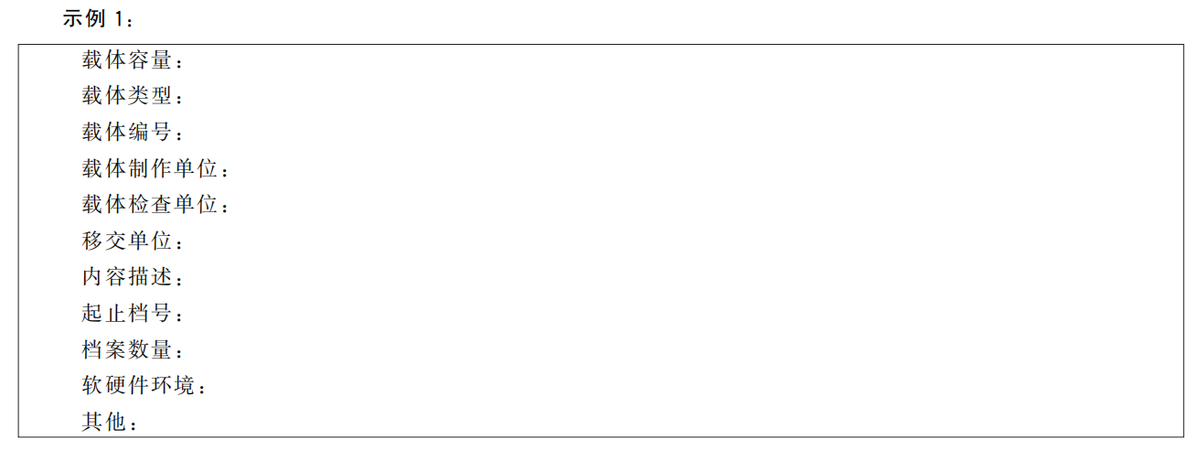 载体盒标注:全宗号、档案门类代码、起止年度、起止档号、载体顺序号、数据量、密级、保管期限、存入日期、运行环境等。