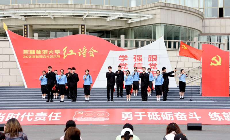 616日,庆祝中国共产党成立100周年校园文化艺术节之“学党史 强信念 跟党走”红诗会总决赛在图书馆前夫子广场举行。学校相关部门负责人、部分师生参加活动。