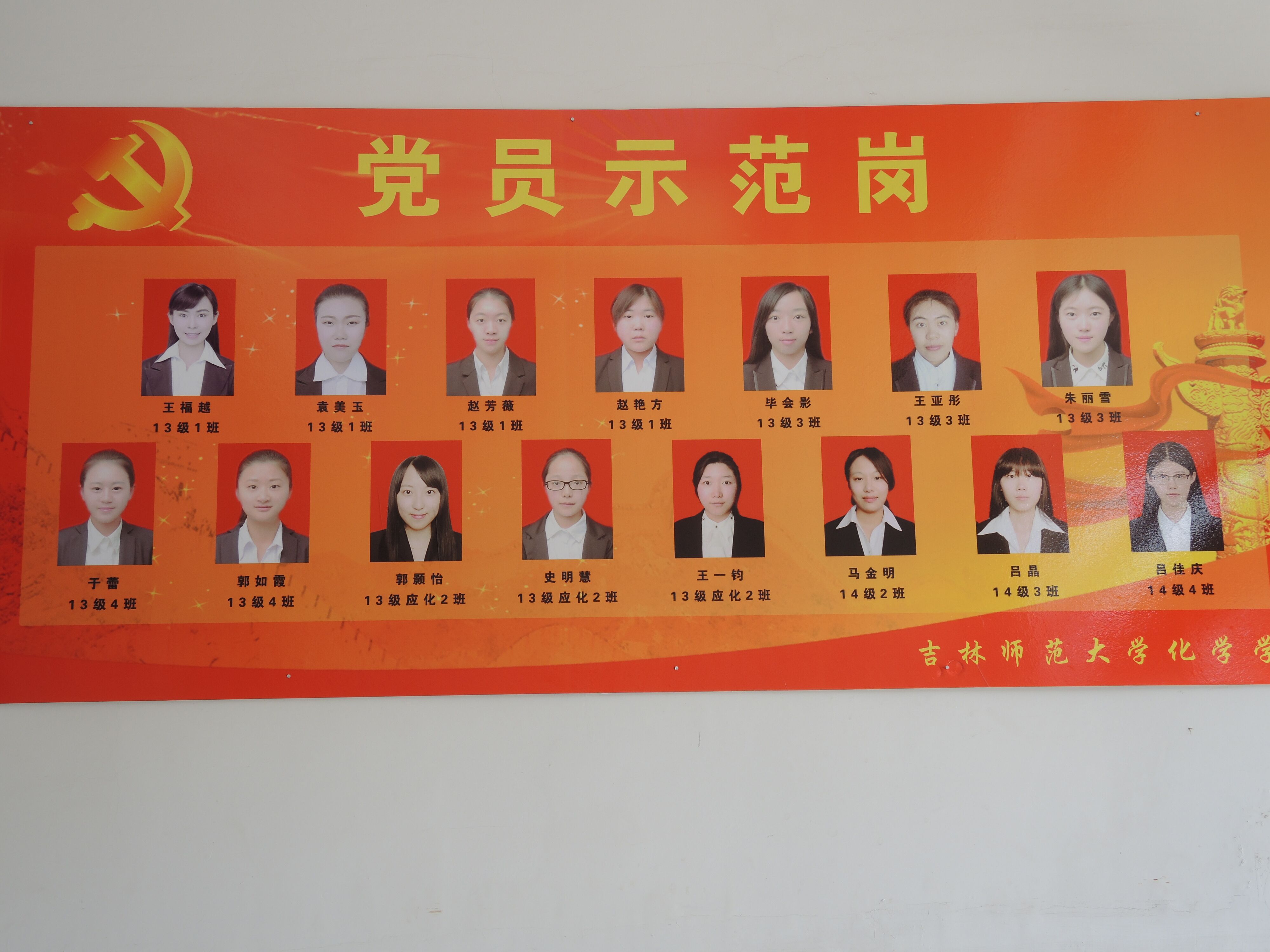按照中央、省委和我校关于建设学习型、服务型、创新型马克思主义执政党的要求和贯彻落实“两学一做”学习教育,进一步推动在全体党员中开展“学党章党规、学系列讲话,做合格党员”学习教育。从5月-12月末,化学学院学生党支部开展以“亮身份、树形象、显作用”为主题的“学生党员示范岗”创建活动。活动选出15名学生党员(包括预备党员)带头示范做教室、宿舍、查课等学生日常管理工作,此活动贴近实际、贴近生活、贴近群众,充分发挥学生党员的辐射和先锋模范作用。此次参加示范岗活动的学生党员和预备党员的信息在第四教学楼通过展板展出。