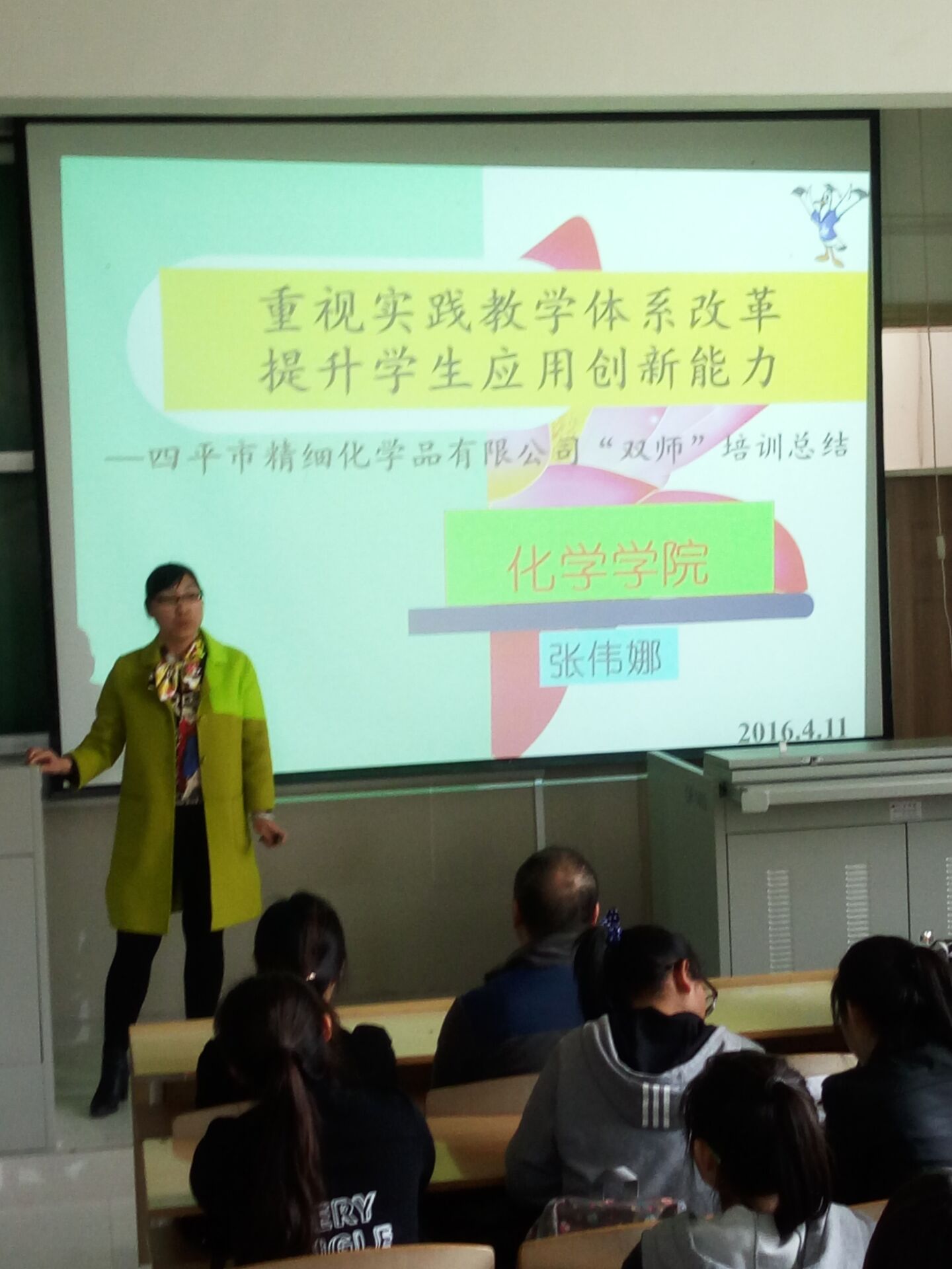2016年4月11日15:30,应用化学专业张伟娜老师于4225教室,举行了题为“重视实践教学体系改革,提升学生创新能力”的双师培训总结报告会,报告会由系主任赵丽娜教授主持,应化系全体教师和应化专业2015级全体本科生出席了本次报告会。