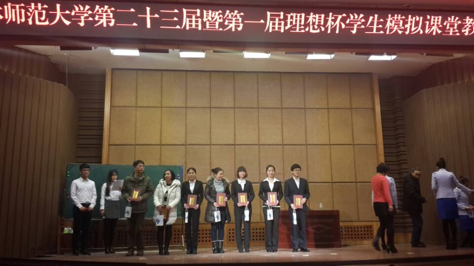 我校第二十三届暨第一届理想杯学生模拟课堂教学大赛于2015年11月29日在图书馆报告厅举行,我院选派的两名选手王福越和张悦同学表现突出,凭借扎实的教学基本功和良好的语言表达能力,分别获得理科非实习生组一等奖和实习生组二等奖的好成绩。希望同学们再接再厉,争取获得更骄人的成绩。