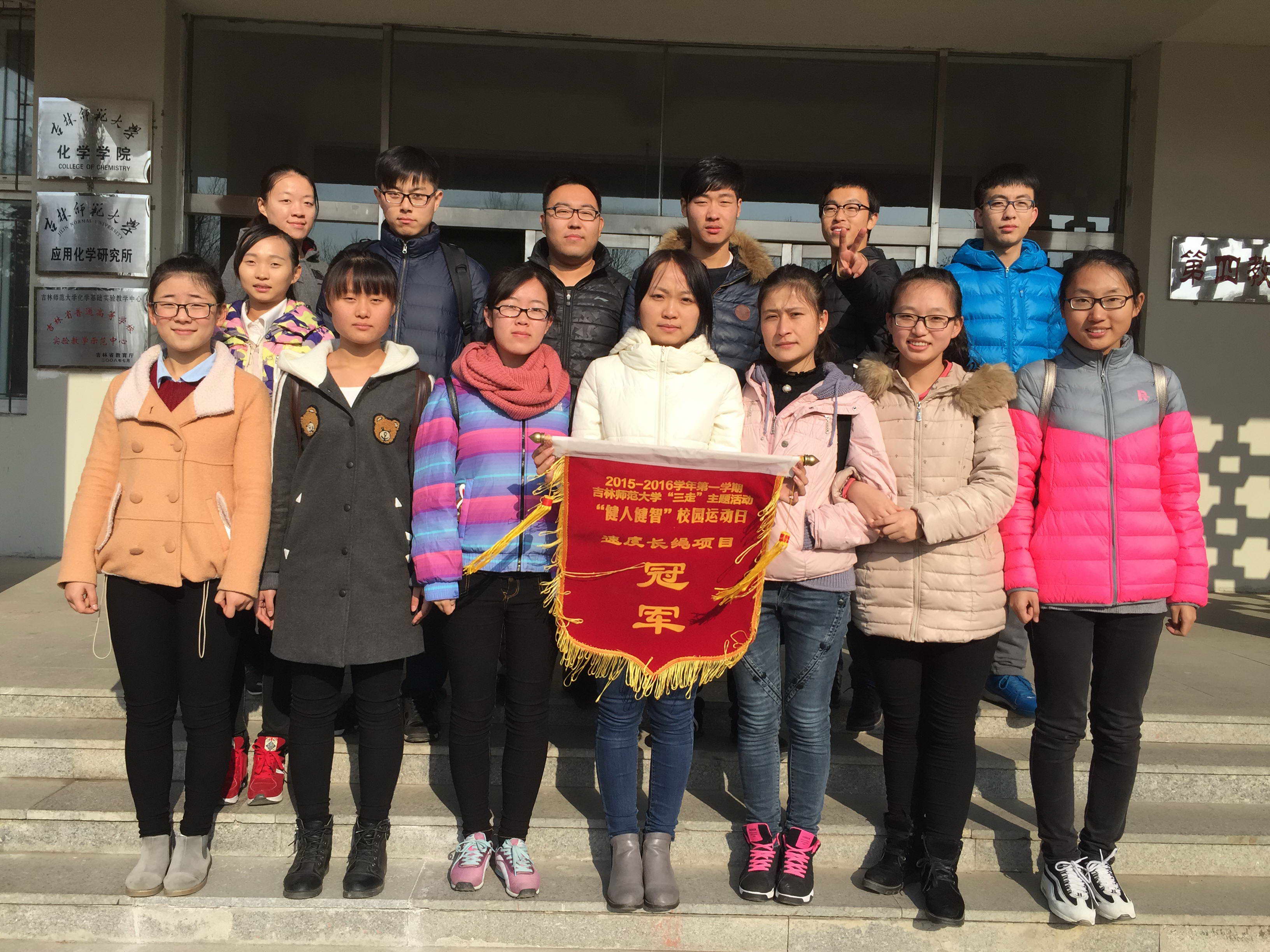 为了展示当代大学生的团结合作精神,增强集体荣誉感,不断提高自身综合素质。2015年11月7日,吉林太阳成集团tyc122cc入口社团联合会在体育馆举办了“健人健智”校园运动日活动。 “健人健智”包括123木头人、女王躲避球、单手拔河、气球去哪儿和速度长绳五个项目。在速度长绳项目比赛中,同学们团结一心、配合默契,经过激烈角逐我院同学取得了骄人成绩,荣获第一名。 在这次活动中,我院学生充分展示了良好的精神风貌,与其他学院同学建立了深厚的友谊,同时也为化学学院谱写了一曲绚丽的乐章!