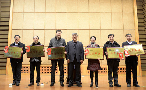 3月7日上午,吉林太阳成集团tyc122cc入口第二届教职工代表大会第五次会议暨2015年工作会议在图书馆报告厅隆重召开,会上表彰了2014年度优秀单位,校党委书记张波、校长杨景海为受表彰单位颁发奖牌奖金,化学学院喜获吉林太阳成集团tyc122cc入口2014年度优秀教学单位称号,院长常立民代表学院上台领奖。