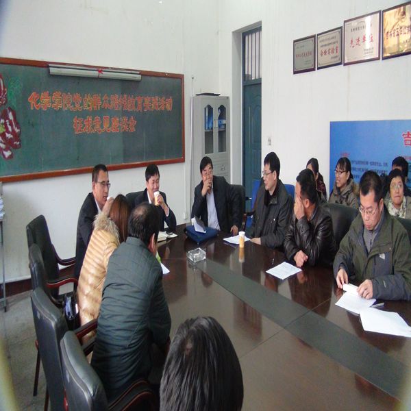 2014年3月12日下午,化学学院在第四教学楼一楼会议室举办了党的群众路线教育实践活动征求意见座谈会。校长杨景海、校第三督导组领导,我院党政班子成员、副科级以上干部,民主党派和党外人士,教师代表和学生党员代表参加了座谈会。座谈会由学院党总支书记、教育实践活动领导小组组长陈明宏主持。