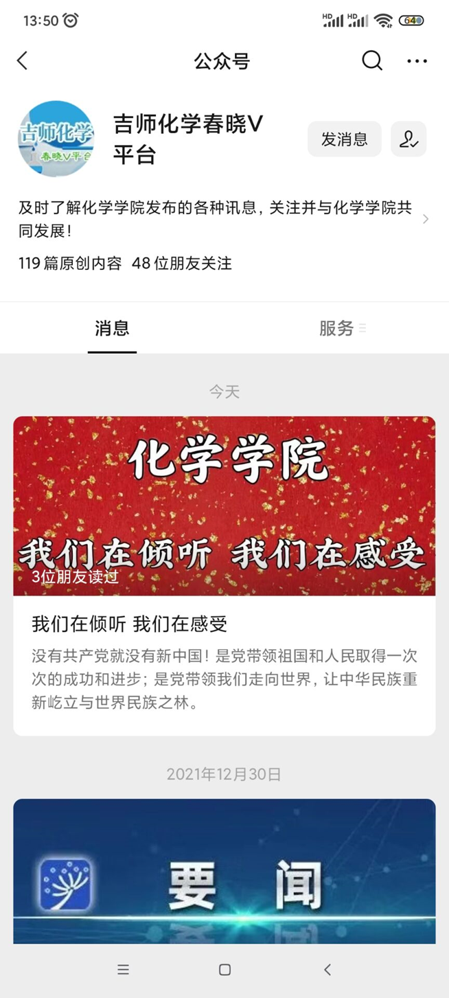 春晓v平台的主要工作就是为化学学院的各种活动、各种获奖情况的网络宣传,可以及时的了解化学学院的各种讯息,关注并与化学学院共同发展!这个微信公众号平台在2017年4月22日将“吉林师大化学”改名为“吉师化学春晓v平台”,更加的为化学学院的宣传做了好开头。在这平台中我们可以了解到化学学院的简介、考研与就业和学院活动等等信息,希望春晓v平台可以再创辉煌。