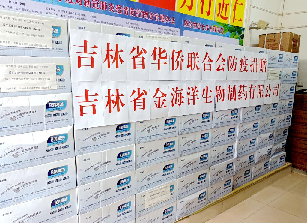 3月28日,由吉林省华侨联合会发起,吉林省金海洋生物制药有限公司向我校捐赠200箱6000瓶消毒液,价值57.6万元。学校和企业严格落实疫情防控要求,实现了防疫物资的转运与存放。