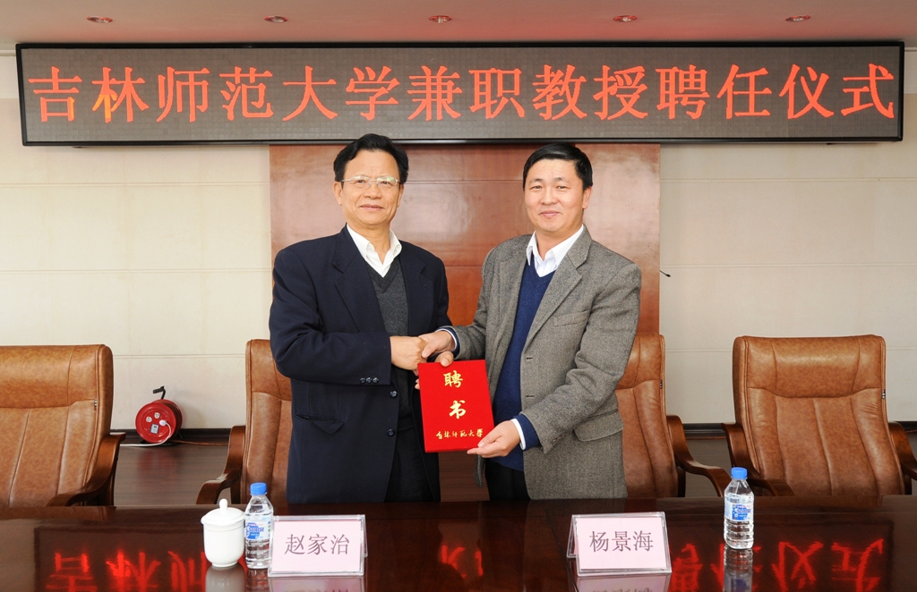 11月7日上午,我校在第一教学楼八楼会议室举行兼职教授聘任仪式,聘任赵家治先生为我校兼职教授。校长杨景海,校长助理李海波出席聘任仪式。李海波主持聘任仪式,杨景海为赵家治颁发聘书。人事处、科研处、历史文化学院负责人参加了聘任仪式。