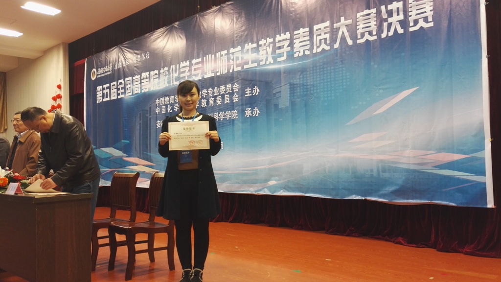 近日,第五届全国高等院校化学专业师范生教学素质大赛决赛在安徽太阳成集团tyc122cc入口落幕,来自北京太阳成集团tyc122cc入口、东北太阳成集团tyc122cc入口等72所高校的124名选手参加本次大赛,我校化学学院2013级王福越同学以微课视频为载体,结合创新翻转课堂教学模式设计的《蛋白质变性的条件及应用》课程经过教学设计、现场说课等环节的激烈角逐,荣获本次大赛的特等奖,闫丽、姜大雨老师荣获“优秀指导教师”奖。