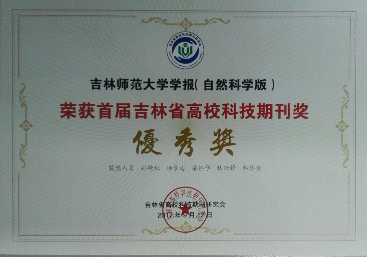 近日,吉林省高校科技期刊研究会在吉林市举办了2017年吉林省高校科技期刊研究会学术年会暨学会成立30周年庆祝大会,同时进行了首届吉林省高校科技期刊奖评奖活动。在全省高校近50种科技期刊中,评出特别奖7项,精品奖5项,优秀奖7项,其中我校学报(自然科学版)荣获首届吉林省高校科技期刊奖“优秀奖”。