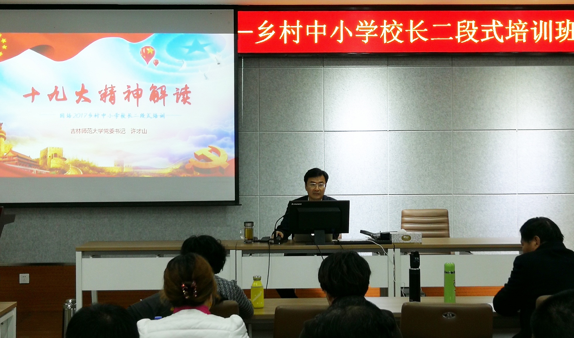 11月24日,我校党委书记许才山,走进了位于长春校区文体馆二楼的多功能教室,为国培计划(2017)乡村中小学校长二段式培训班的全体学员作了十九大精神解读宣讲。