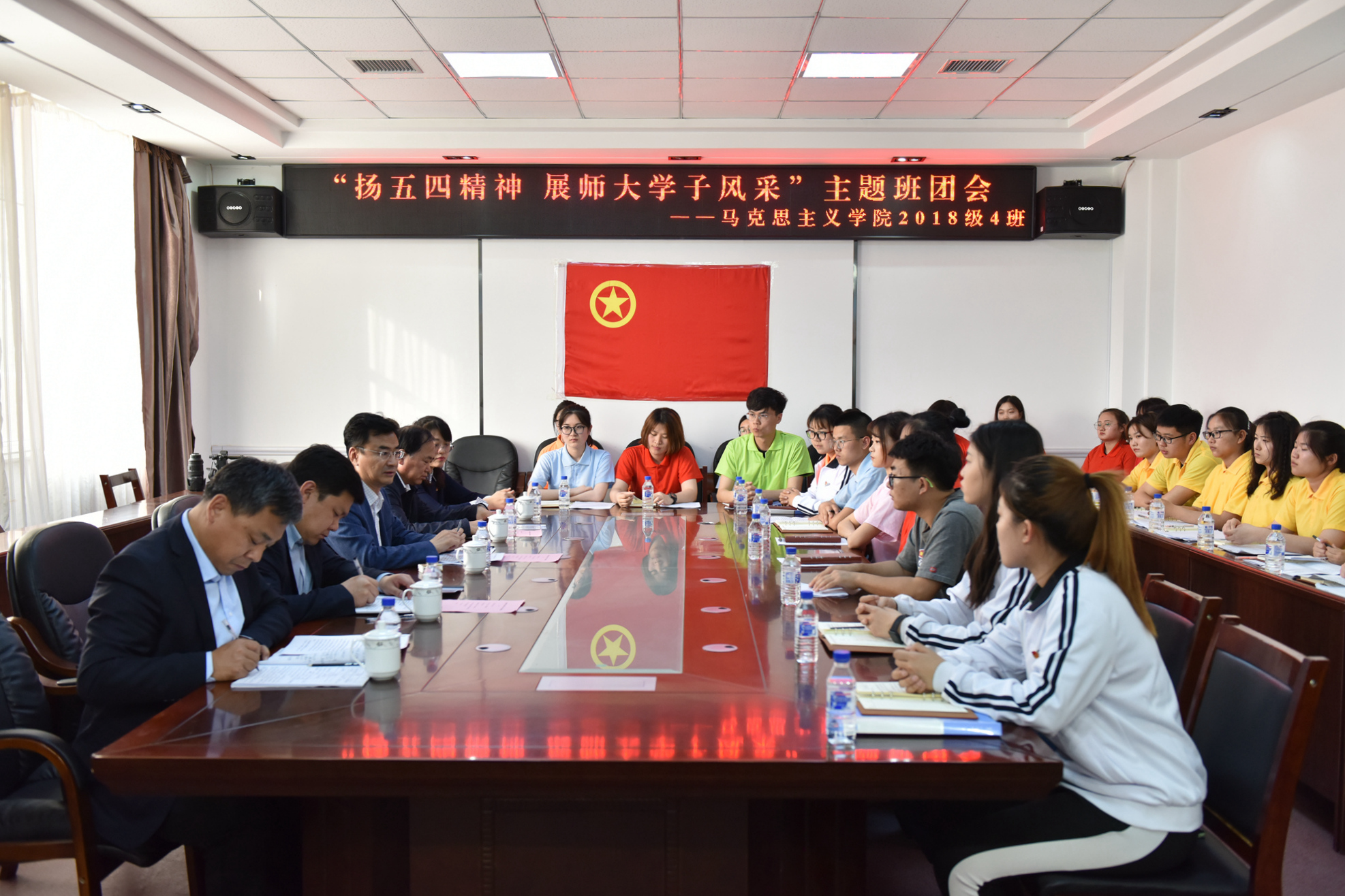 5月16日,我校马克思主义学院思想政治教育专业2018级4班召开“扬五四精神,展师大学子风采”主题班团会。校党委书记许才山参加班团会并与学生们亲切交流,马克思主义学院及学校相关职能部门负责人参加活动。