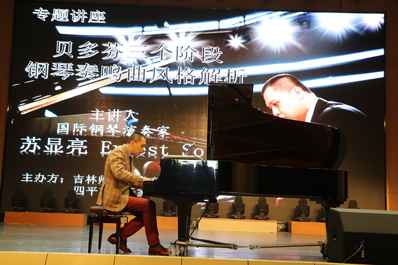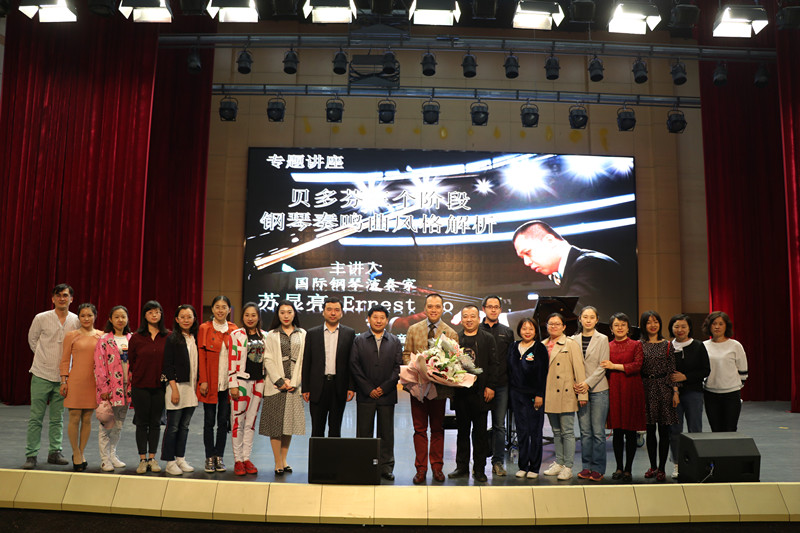 2019年5月16日下午,我院客座教授、国际著名钢琴演奏家苏显亮先生,在音乐厅作了题为《贝多芬三个阶段钢琴奏鸣曲风格解析》的学术讲座。副校长张作岭教授出席,院长胡晓伟教授主持讲座,院党总支书记陈明宏、副院长任会平、颜铁军和我院师生及其他学院部分学生听取了讲座。