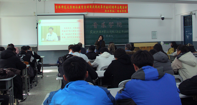陈书记最后指出,此次报告会是学校党委统一安排的庆祝改革开放40周年主题宣讲活动之一,也是音乐学院庆祝改革开放40周年系列活动的第一项活动,今后还将结合学院特点组织开展包括知识竞赛、报告会、音乐会、主题班团会等多种形式的活动。希望同学们努力学习,学习历史政治知识,提高文化素质和思想素质,学好专业技能和人生本领,抓住新时代发展的大好时机,坚定理想信念,争做时代弄潮儿,为中华民族伟大复兴多做贡献。