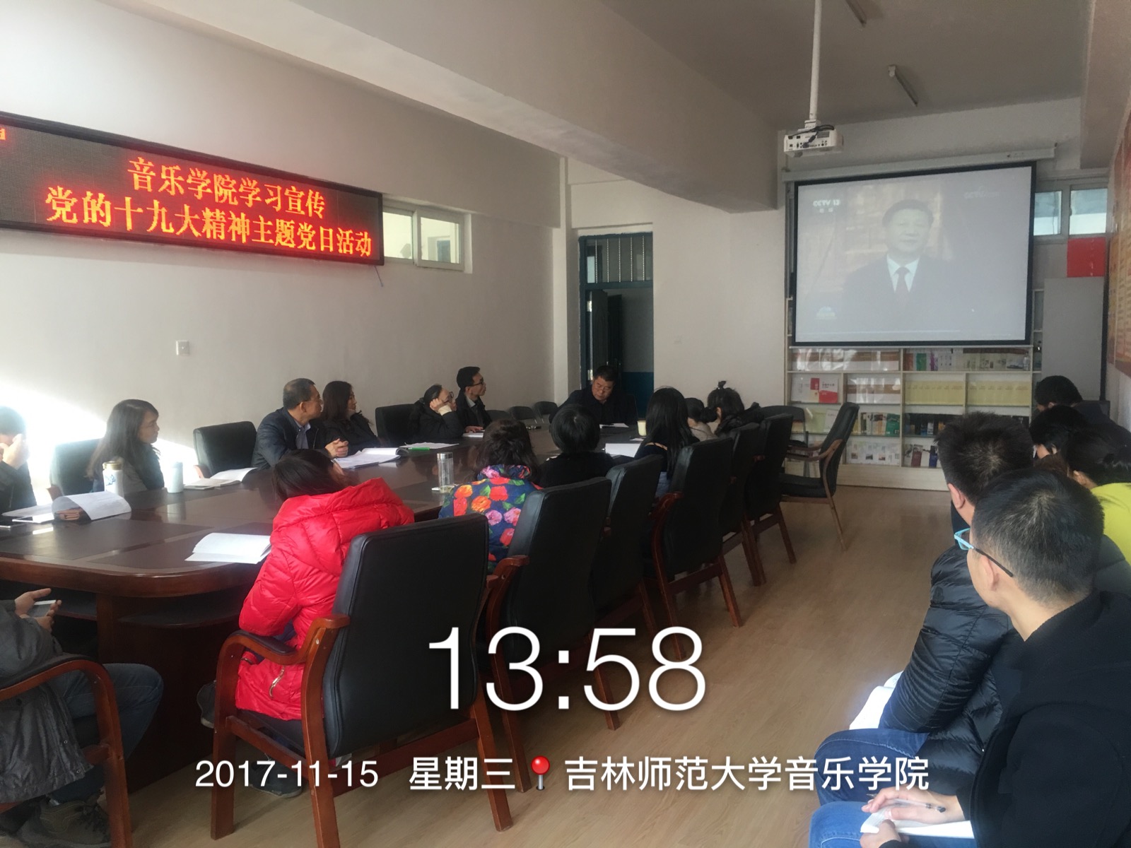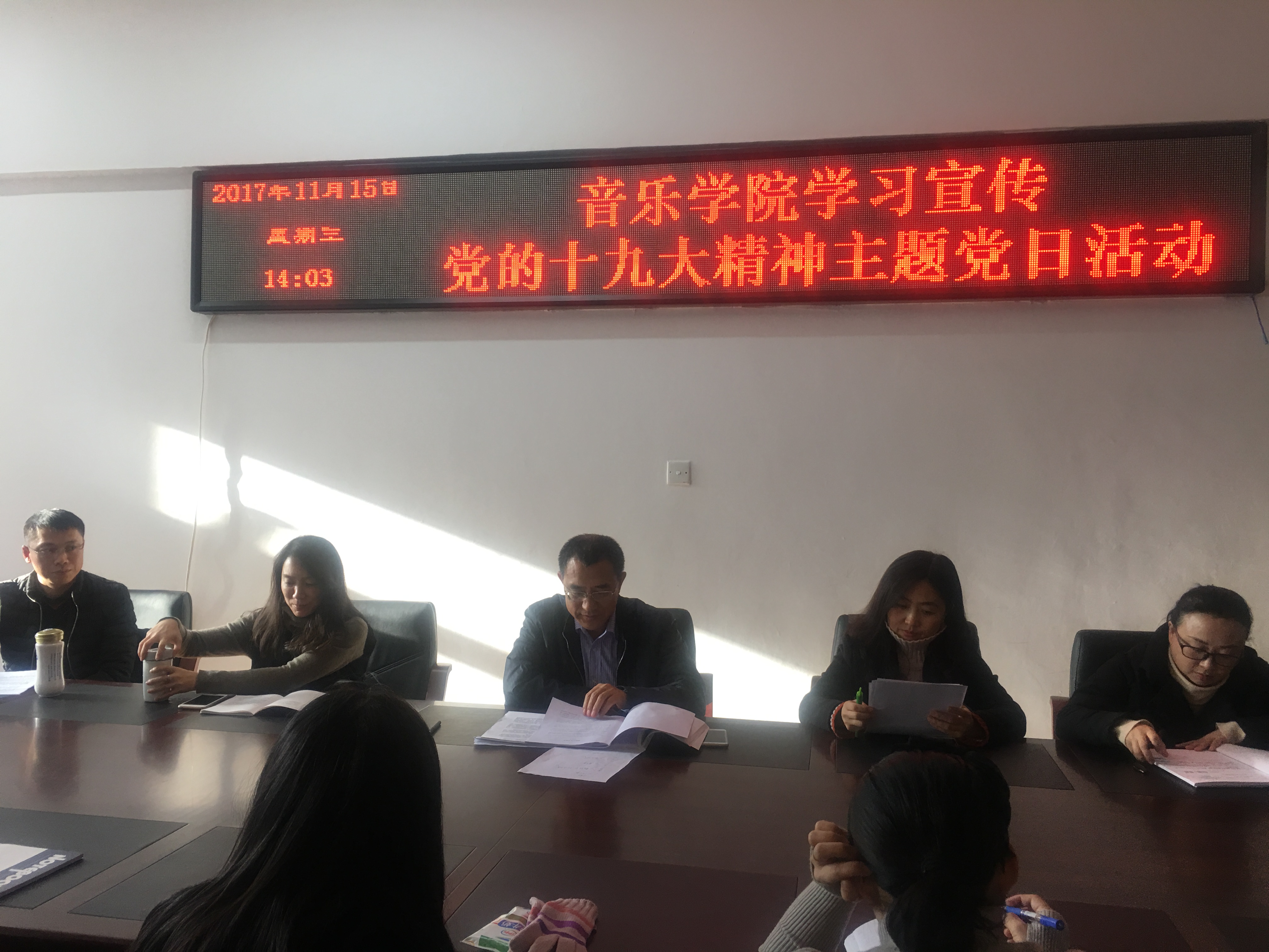 2017年11月15日下午,音乐学院党总支在学院三楼党员活动室开展学习宣传党的十九大精神主题党日活动(党课),专题学习党的十九大报告。院党总支书记陈明宏主持会议并讲话,党总支副书记闫薇、副院长任会平、颜铁军和全体师生党员参加了学习活动。