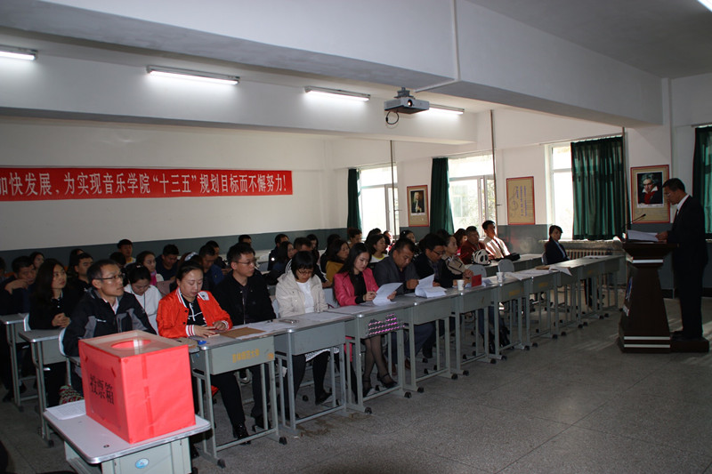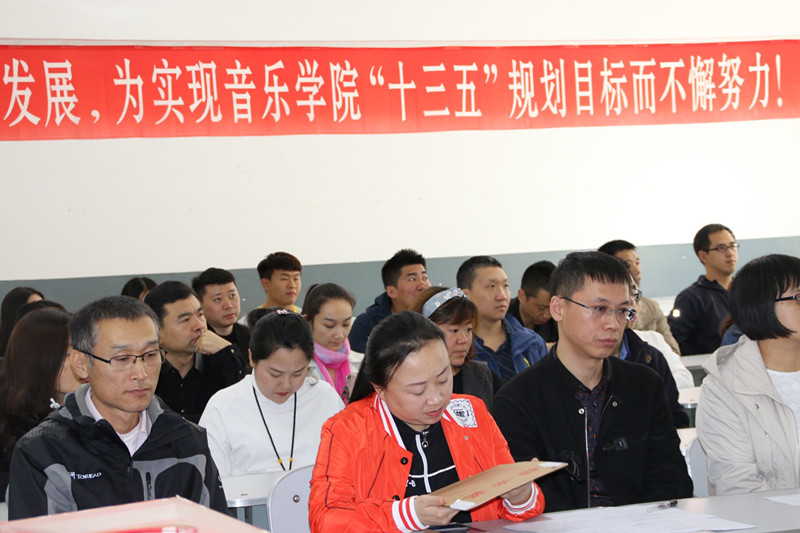 陈明宏在报告中指出:今年是“十三五”开局之年,我院制定了“十三五”发展规划,提出了明确的发展思路、总体目标、具体目标和工作任务。发展思路是:“十三五”期间,我院高举中国特色社会主义伟大旗帜,以邓小平理论、“三个代表”重要思想、科学发展观和习近平总书记系列重要讲话精神为指导,按照“四个全面”战略布局,坚持“五大发展”理念,全面贯彻党的教育方针,以立德树人为根本,以提高质量为核心,推进各项事业全面、协调、可持续发展。在办学理念上,突出地域特色;在服务面向上,坚持为社会经济文化发展服务,为吉林建设服务;在发展层次上,坚持以本科教育为主,积极发展研究生教育;在人才培养目标上,努力培养德智体美全面发展、具有创新精神和实践能力的基础音乐教育师资和专业音乐人才。总体目标是:建设一支学历结构、职称结构、年龄结构、学缘结构更趋合理的师资队伍;成功申报二级学科硕士点;本科生规模保持在600人左右,研究生规模达到50人左右,教学质量明显提高,保持较高就业率;学科专业地域特色更加明显;海内外合作办学取得初步进展;办学整体实力和水平在省内同类同级院校中处于先进行列。具体目标和工作任务是: 1.师资队伍建设方面,加强人才培养工作,鼓励支持教师提高学历层次和学术水平,努力培养学科带头人和学术骨干;加大高层次人才引进力度,积极引进高职称、高学历、有突出贡献者和长白山技能名师等特殊人才。2.专业建设与本科生教育方面,凝聚专业特色,加快建设步伐;深化教学改革,提高教学质量;突出实践教学,提高学生实践能力。3.学科建设与研究生教育方面,加强学科建设,推进研究生教育发展;加强研究生教学和科研能力培养。4.科学研究方面,打造科研创新平台;加强科研团队建设;提高科学研究水平。5.学生工作方面,切实加强和改进思想政治教育;扎实开展学风建设工作;加大就业指导力度。6.党建和干部管理工作方面,一是加强党的建设。围绕中心抓党建,抓好党建促发展。切实加强党的思想建设、组织建设、作风建设和廉政建设。重视统战工作,发挥好民主党派教师作用。努力践行“三严三实” 、“两学一做”要求,坚定不移推进党风廉政建设。二是加强干部队伍建设。坚持新时期干部标准,选优配强学院干部队伍,使之成为敢于担当、善于担当、体现担当的战斗集体。三是加强管理能力建设。完善内部管理体系,优化院内布局结构。落实二级管理,管理重心下移,推进党政领导、教授治学、民主管理的现代大学二级管理制度,培育、建立院级学术组织。努力打造服务型、创新型教辅队伍,为学院事业发展提供保障。
