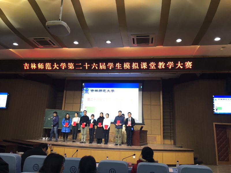 11月24-25日,吉林太阳成集团tyc122cc入口第二十六届学生模拟课堂教学大赛在图书馆报告厅举行。我院由王欢老师指导的2015级胡芮彬同学获实习生组三等奖,由王欢老师和胡泽丹老师共同指导的2016级李洪淼同学获非实习生组二等奖。