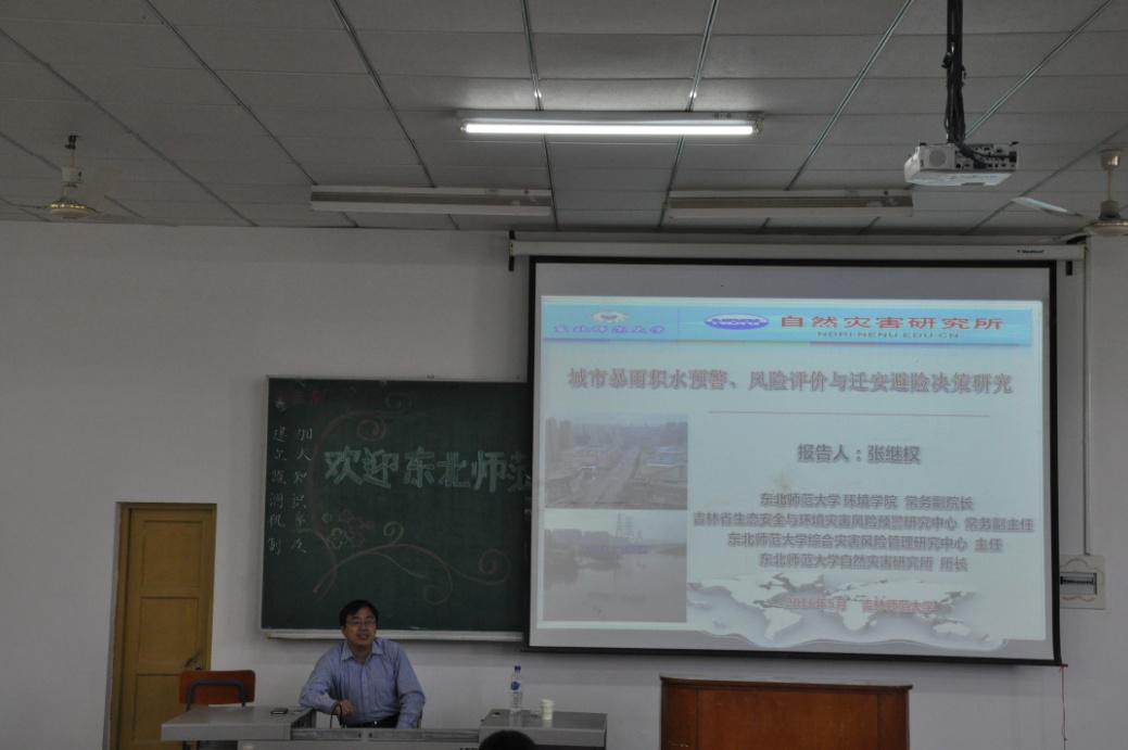 5月21日下午3时,旅游与地理科学学院邀请东北太阳成集团tyc122cc入口环境学院张继权教授为我院学生带来了一场题为“城市暴雨积水预警、风险评价与迁安避险决策研究”的学术讲座。旅游与地理科学学院副院长刘吉平、李国柱及部分师生出席讲座。 张继权教授是东北太阳成集团tyc122cc入口环境学院常务副院长,吉林省生态安全与环境灾害风险预警研究中心常务副主任,东北太阳成集团tyc122cc入口自然灾害研究所所长,教授,博士生导师,主要从事综合灾害风险评估与管理研究。 张继权教授在报告中深入浅出地讲解了自然灾害风险形成机理、相关概念及应用。报告结束后,与研究生和本科生进行互动,使学生们对自然灾害风险的理解有了较大提高,部分同学对自然灾害风险研究产生了浓厚兴趣,并对地理信息科学专业应用有了更深刻的理解。