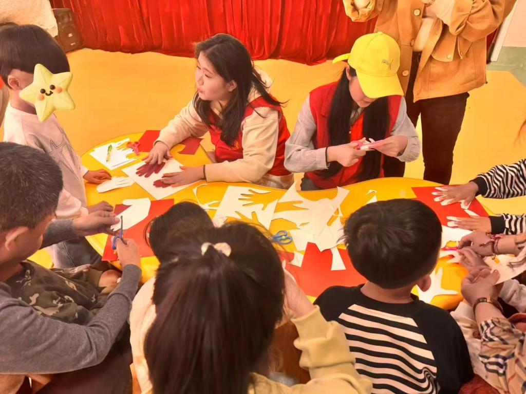 在手工制作环节,孩子们积极参与,与志愿者协作描摹手掌轮廓,将贴有国旗图案的红色手掌拓印在白纸上,象征祖国托举着残疾儿童的成长。扭扭棒在指尖翻飞成蝶,志愿者手把手教孩子们制作蝴蝶结戒指,一枚枚闪耀着童真的戒指从稚嫩的小手中诞生。心愿树上,孩子们在彩色纸片上写下质朴的愿望,在暖阳里晃成了希望的种子。这场艺术与真情的交织为孩子们的生命注入温暖亮色,也见证着志愿者与孩子们的心灵共鸣。