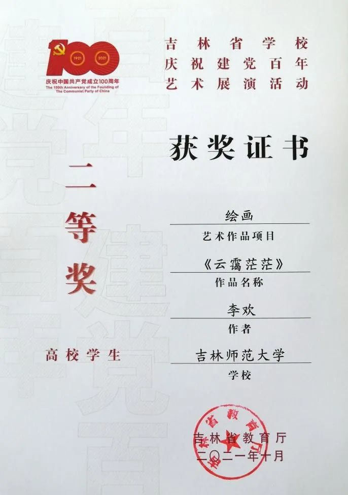 2019级研究生李欢、2018级绘画专业赵天旺同学在吉林省学校庆祝建党百年艺术展演活动中获二等奖。