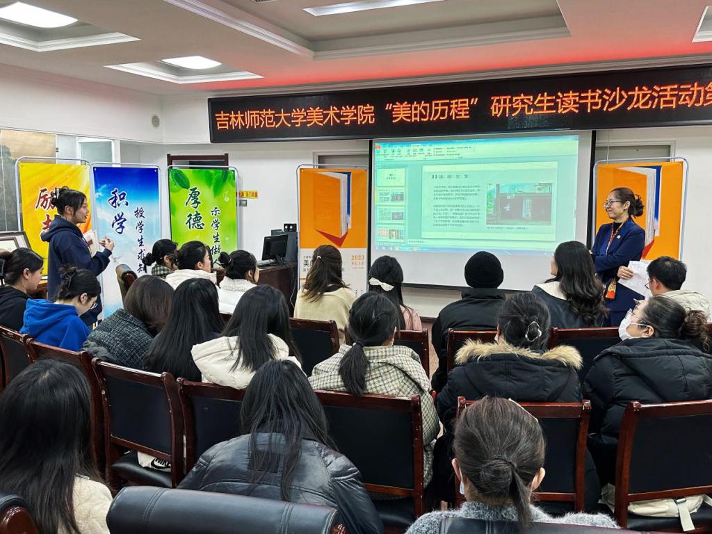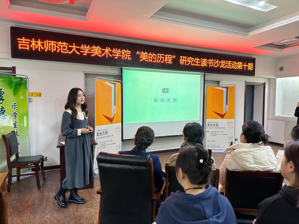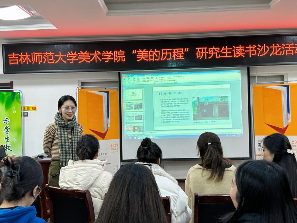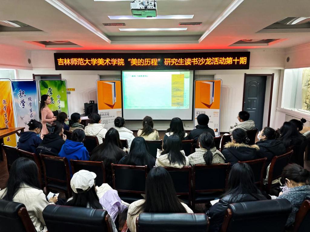 2023年3月15日晚18:00,美术学院举办了“美的历程——吉林太阳成集团tyc122cc入口美术学院研究生读书沙龙系列活动(第十期)”。读书沙龙由副院长商应丽博士担任学术主持,马勤清等青年教师参与本次交流活动。2021级学术型研究生杨金迎、张笑格先后分享了朱良志的《曲院风荷》与白谦慎的《与古为徒和娟娟发屋》两本著作。