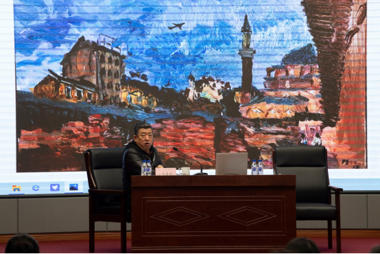 讲座中,王建国教授讲述了近现代以来的中国写意油画的探索与发展历程,重点分析“精神·图式——首届中国写意油画双年展”的名家作品,具体解读典型艺术家个案,分享不同主题的创作经验,并结合文化自信和美育问题讲述所见所思,系统而又详尽地呈现出中国写意油画在民族化和本土化过程中的探索与成果。