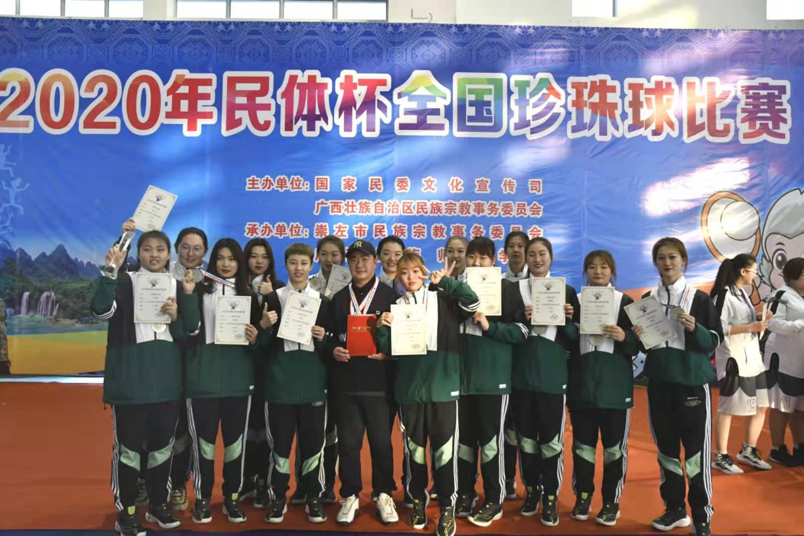 12月8-10日,由国家民族事务委员会文化宣传司主办,广西崇左市民宗事务委员会承办的“民体杯”全国珍珠球比赛在广西民族师范学院体育馆举行,大赛共有吉林、宁夏、浙江、湖南、重庆、河北、江苏、广西等省(市、自治区)高校代表队参赛。我校体育学院首次派出女子珍珠球运动队代表吉林省参赛,在教练佟云龙老师的指导下,经过3天的激烈角逐,最终获得了本次比赛的二等奖。获奖师生合