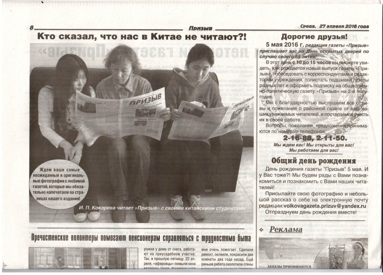 4月27日,俄罗斯《号召报》登载了一幅照片,题为:谁说在中国没有人读《号召报》?!并介绍了我校俄语系学生的学习情况。