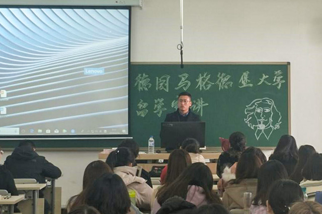 会上,栾老师介绍了马格德堡大学的基本情况以及该校与我校在留学项目上的开展情况。2017年,我校与德国马格德堡大学校签署友好合作协议,双方合作密切,目前德语系累计十余人次前往该校开展国际交流与合作。栾老师还着重介绍了目前与我校开展的包括攻读MBA项目、研修夏令营项目和大三年级交换项目等国际交流合作项目。在现场互动环节中,同学们踊跃提问,栾老师对同学们提出的问题一一做出了解答,现场气氛活跃。