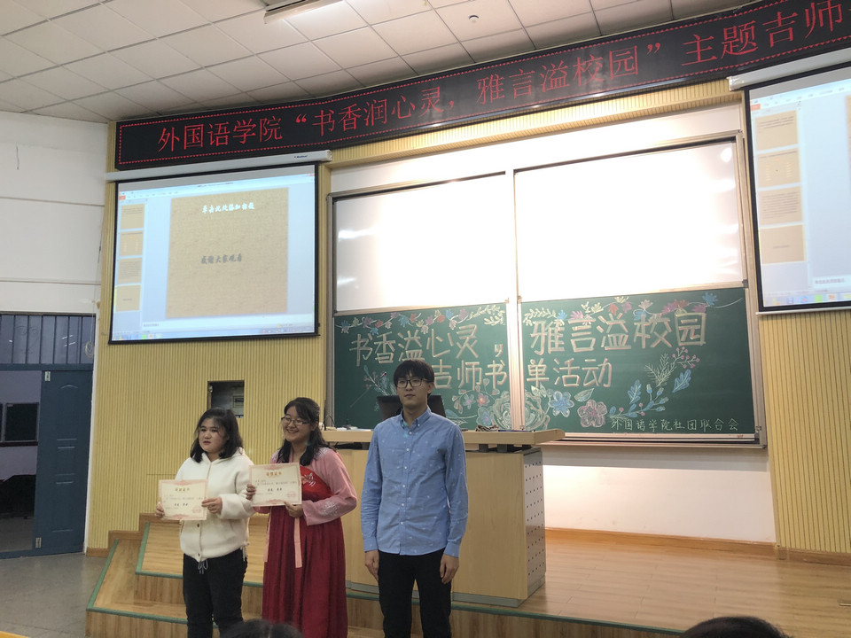 11月17日晚,学院社团联合会主办的“书香润心灵,雅言溢校园”吉师书单分享交流会活动圆满完成。来自2019级的11位同学向同学们推荐自己喜欢的书目,分享自己的读书心得与思考,与会同学们收获颇多。