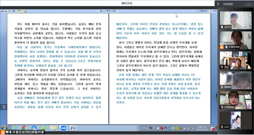赛事由朝鲜语系许春花老师主持,金红月老师和赵春明老师担任评委,朝鲜语系2020级全体39名同学参加了比赛。根据赛事规则,全体参赛学生全程开启视频,比赛中不能接触手机,定时10分钟,通过共享屏幕展示韩语打字材料,以最终正确打字数量决定名次。经过激烈角逐,闫彤和吴梦繁同学以压倒性优势获得特等奖,同时还角逐出一、二、三等奖若干名。