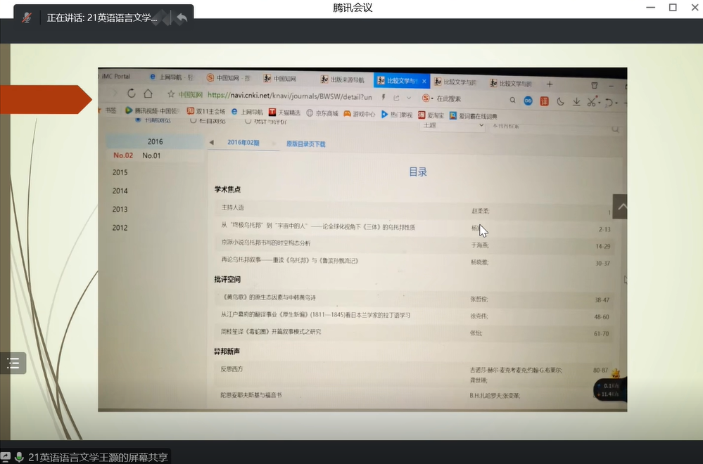 21级英语文学方向王灏同学从文献阅读、专业比赛和研究生生活三方面分享学习心得。她介绍如何通过知网查找选题方向,推荐多种文献检索网站、文献翻译工具和学术相关公众号;鼓励大家积极参加校内外英语竞赛,以赛促学;劳逸结合,加强锻身体炼。